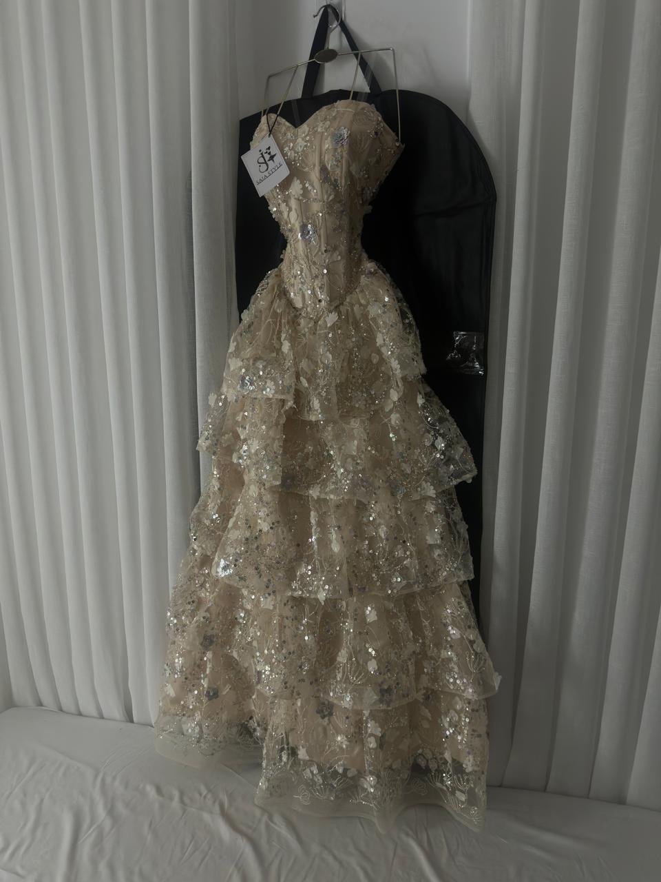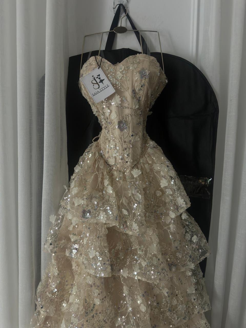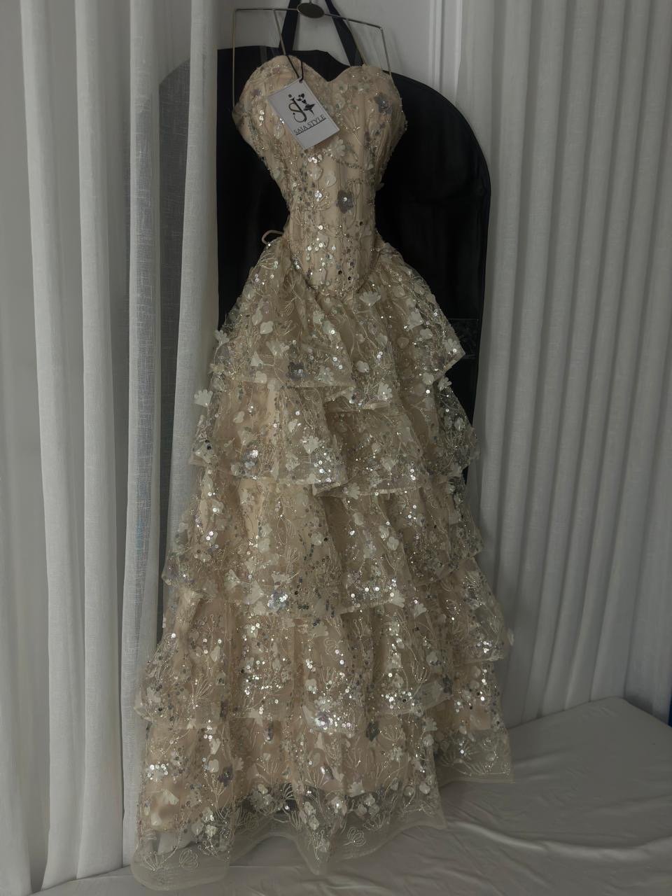 فستان سهرة ذهبي مطرز بالترتر والورود البارزة بطبقات فخمه